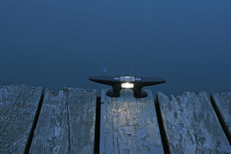 The 8" Nylon Solar Cleat Light is perfect for all types of docks. The same bolt pattern as most popular nylon 8" cleats, it makes a great substitute for existing 8" cleats! Easy hassle-free lighting keeps you from tripping over cleats at night. No more stubbed toes after an evening boat ride! Easy to spot and tie up at night makes evening boating a breeze. Two ultra high intensity LEDs illuminate outward from both sides of the cleat. Our compact, but powerful solar panel on the top surface collects the sun's energy to keep the high quality user-replaceable battery charged and ready to power the LEDs all night long.